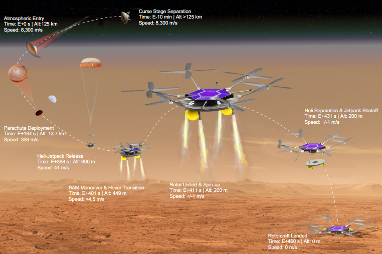 « J’ai travaillé sur le projet MAHD (Mid Air Helicopter Deployment), qui vise à faciliter et réduire le coût des futurs déploiements d’hélicoptères sur Mars. Ingenuity, l’hélicoptère envoyé sur Mars entre 2021 et 2024, a été une avancée énorme pour l’exploration martienne, car il a permis de parcourir de grandes distances rapidement et d’accéder à des terrains dangereux pour les rovers traditionnels. Au lieu d’utiliser un atterrisseur pour se poser sur Mars, le projet MAHD utilise un jetpack attaché à l’hélicoptère pour ralentir sa descente après la séparation de l’aéroshell. Ça permet à l’hélicoptère de décoller en plein vol sans avoir besoin d’un système d’atterrissage compliqué »